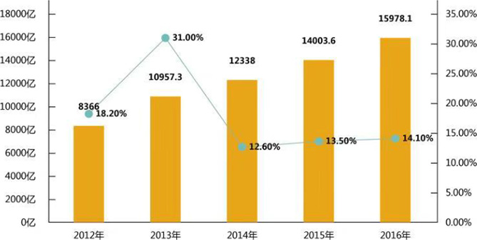 2016年全國家政市場規(guī)模為1.6萬億元,年增長14%